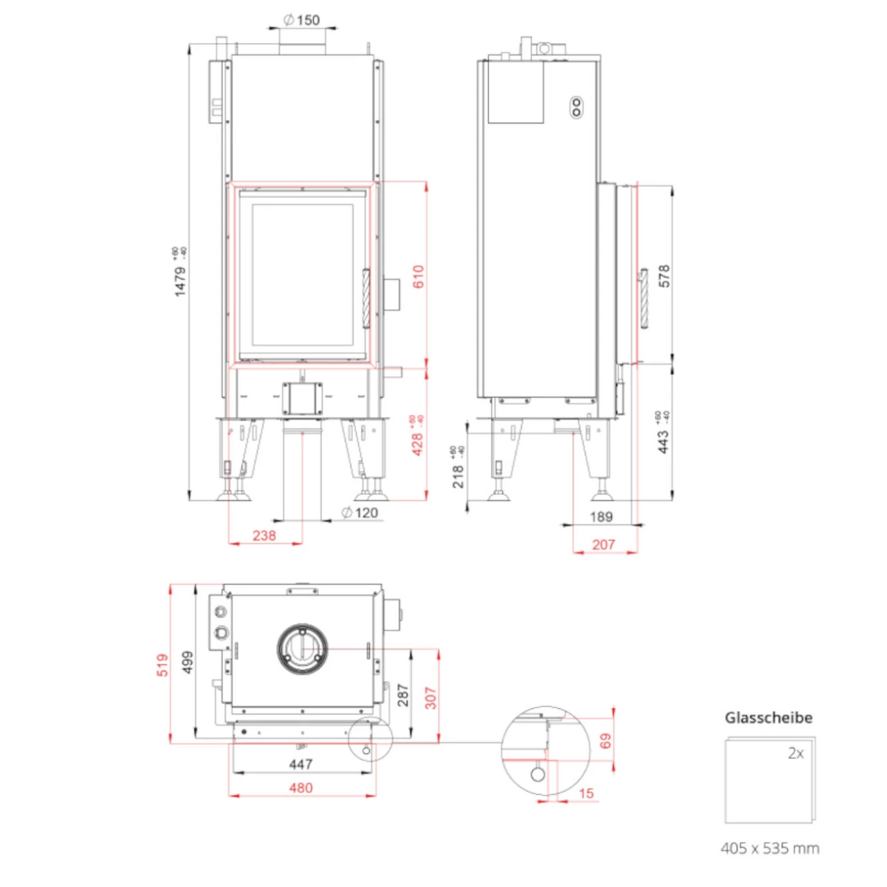 - Durchmesser Rauchrohr-Anschluss: 150 mm