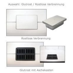 - Ascherost und umfangreichen Aschetopf aus Gusseisen ODER Rostlose Verbrennung (Brennraum ohne Rost) – die Holz Glut liegt direkt auf dem Carconboden des Brennraumes, dadurch wird die Glut nicht so abgekühlt und führt zu einer vollständige Holzverbrennung und einem hohen Wirkungsgrad. Sie können Wählen welche Variante Sie bevorzugen.