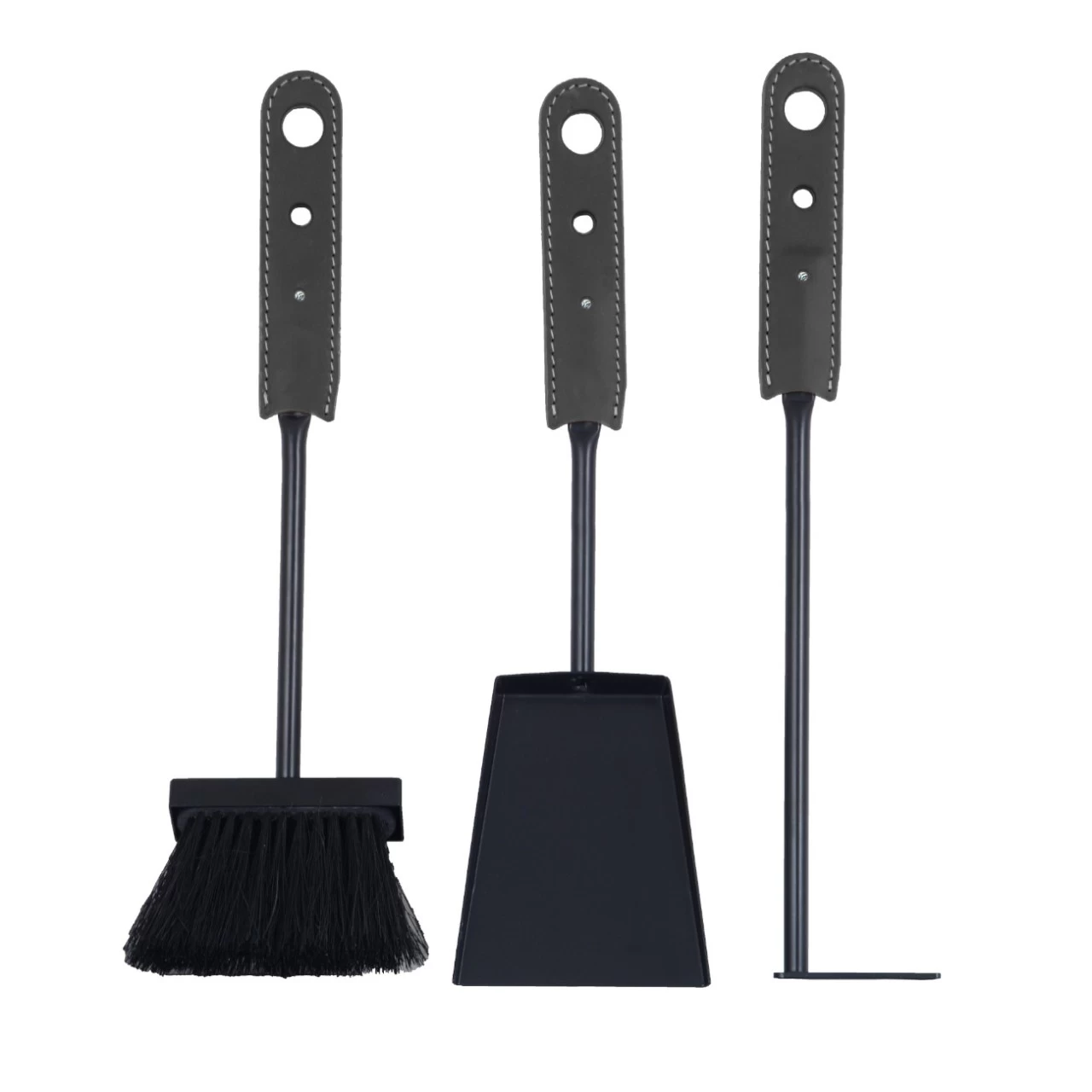 Das Kaminbesteck besteht aus einer Schaufel, einem Schürhaken und einem Besen, alles aus lackiertem Stahl.