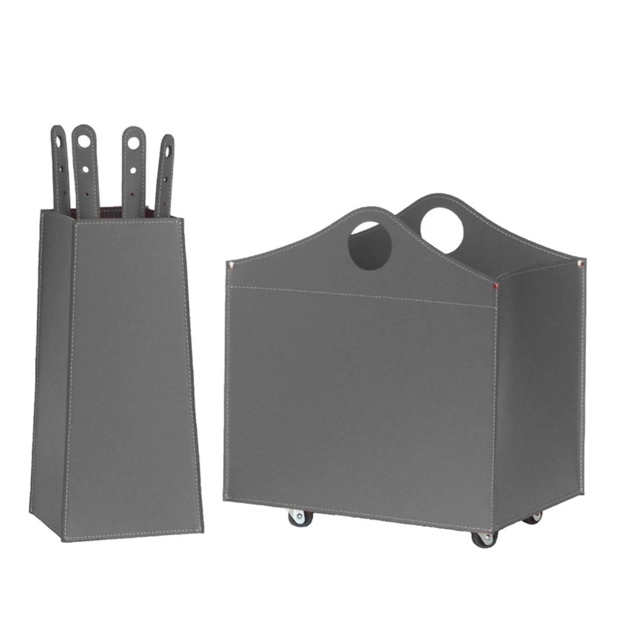 Set bestehend aus Kaminbesteckhalter aus Leder Mod. „Botin“ und 4-teiliges Kaminbesteck mit Ledergriff Mod. „Mary“. Holzkorb aus regeneriertem Leder Modell „Woodbag Mini“