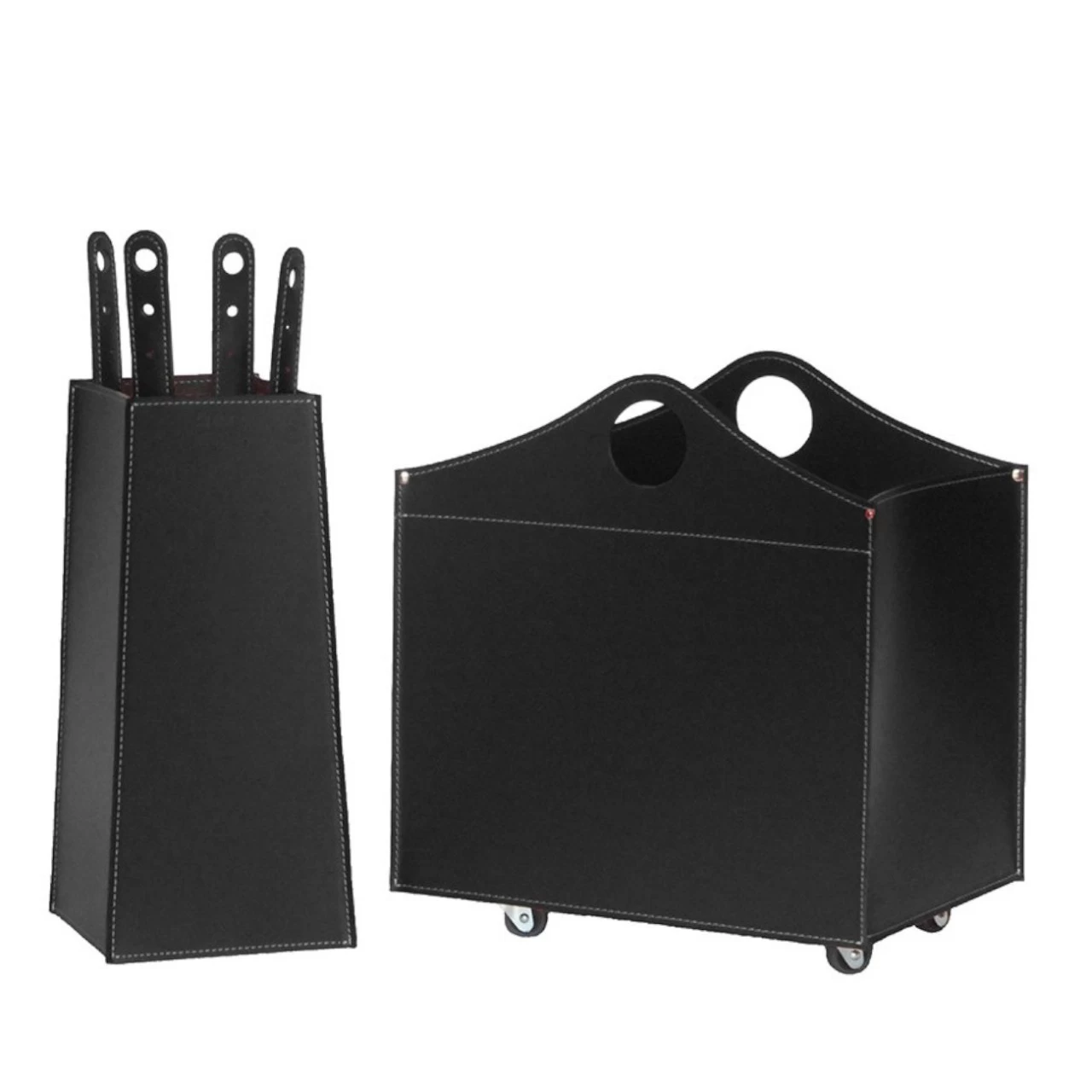 Set bestehend aus Kaminbesteckhalter aus Leder Mod. „Botin“ und 4-teiliges Kaminbesteck mit Ledergriff Mod. „Mary“. Holzkorb aus regeneriertem Leder Modell „Woodbag Mini“