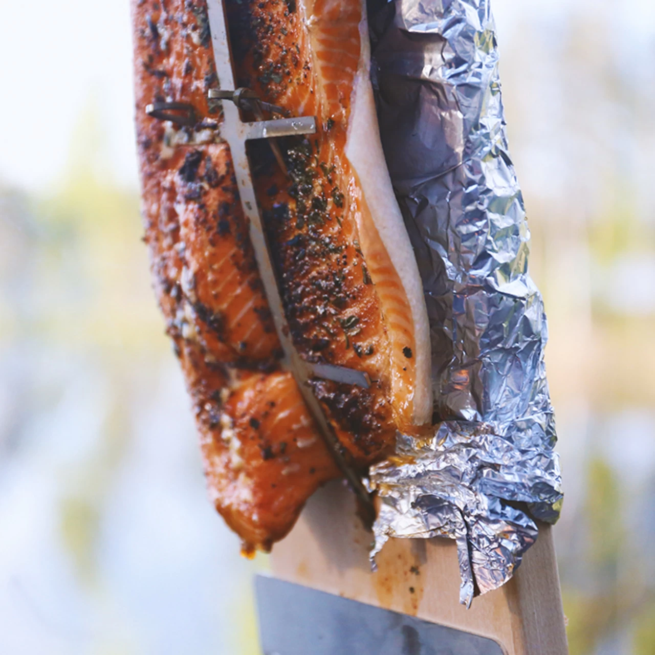 Flammbrett mit Erdspieß (nicht direkt im Tundra Grill® zu verwenden)- dieses Flammbrett ist zum Gebrauch neben einem Feuer geeignet, das Flammbrett wird in Feuernähe in den Boden gesteckt, somit erhält Ihr Essen den rauchigen Geschmack vom offenen Feuer und z.B. der Lachs wird schonend gegart.