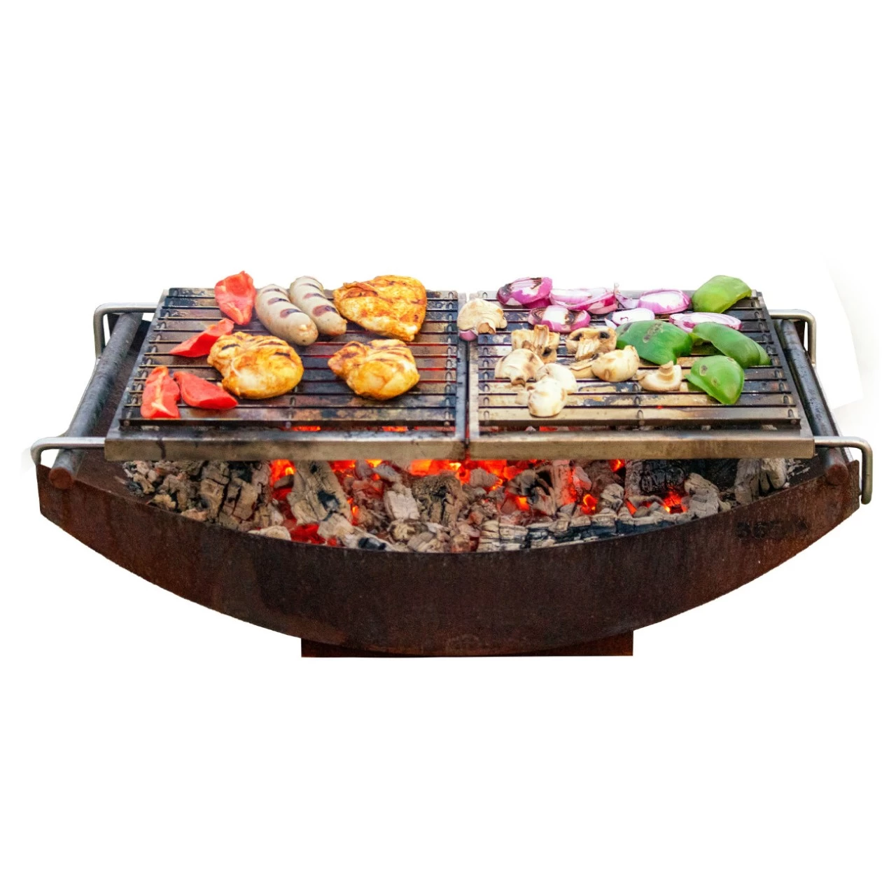 Für Minimalisten oder kleine Grillrunden kann Akira auch als Grill genutzt werden. Ist der separat erhältliche Grillrost aufgelegt, ergeben sich durch den gerundeten Schalenboden unterschiedliche Abstände zwischen Glut und Grillgut. Der Rost lässt sich über die gesamte Breite verschieben und ganz nach Wunsch wird dadurch mit mehr oder weniger Hitze von unten gegrillt.