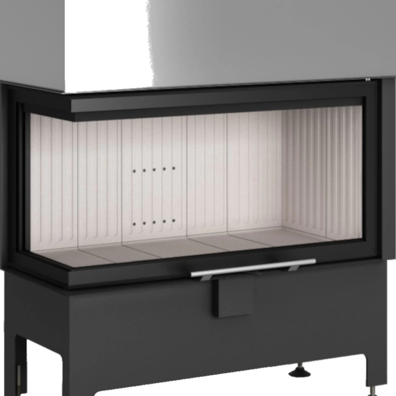 Der Feuerraum ist mit einer 3 cm starken Keramik-Auskleidung in weiß ausgestattet. Der Kamineinsatz verfügt über eine Tür mit einer ergonomischen und belüfteten Öffnungsgriffstange aus Edelstahl und ist für eine langfristige, störungsfreie und ökonomische Nutzung gebaut.