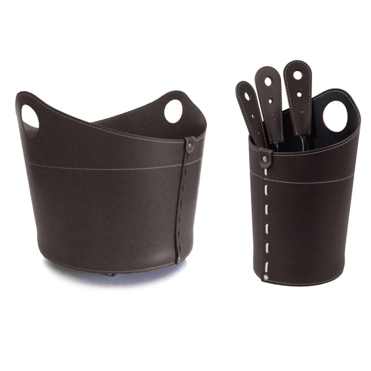Set bestehend aus Kaminbesteckhalter aus Leder Mod. „Brogio“ und 3-teiliges Kaminbesteck mit Ledergriff Mod. „Corla“. Holzkorb aus regeneriertem Leder Modell Cadin „Mini“
