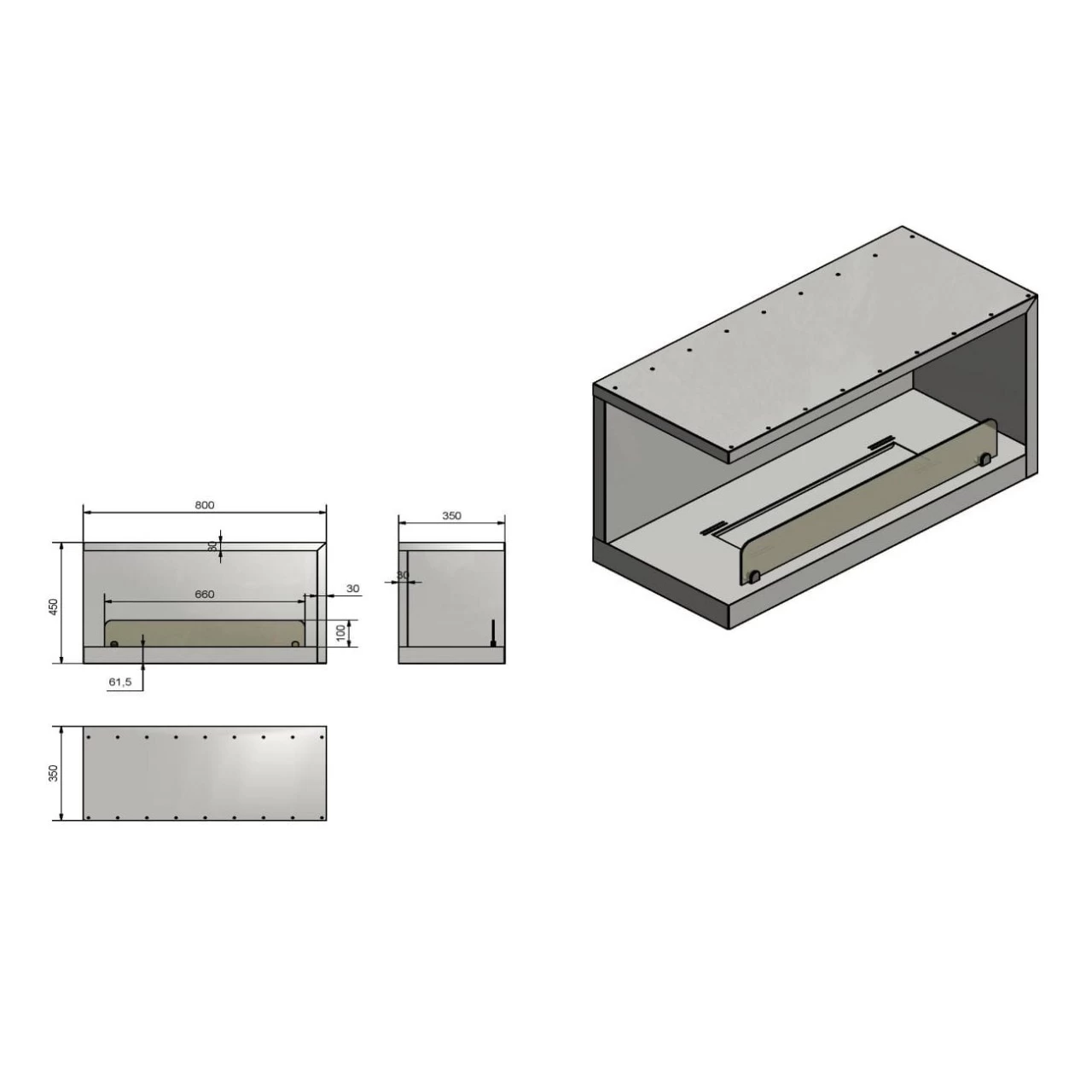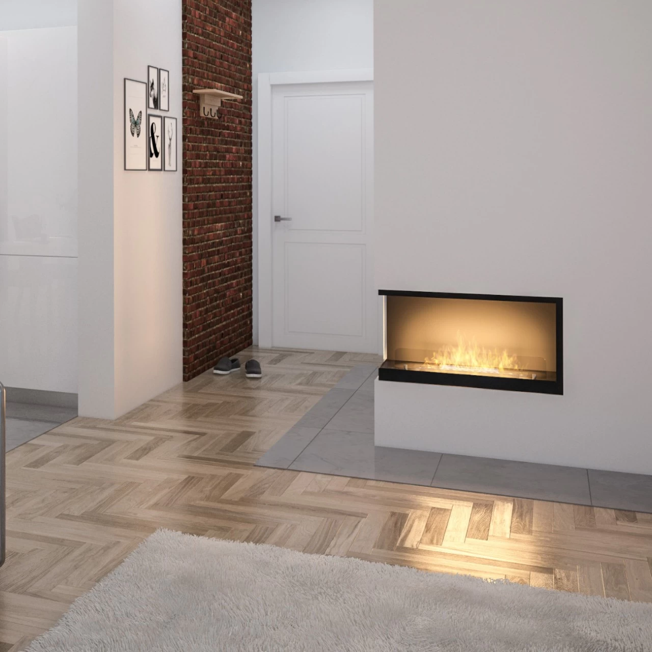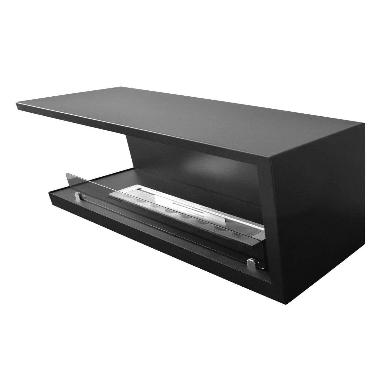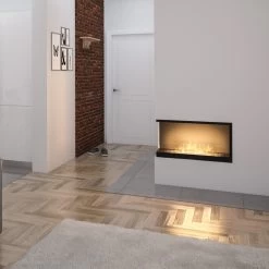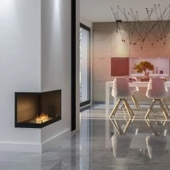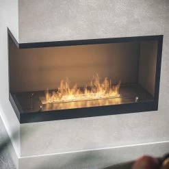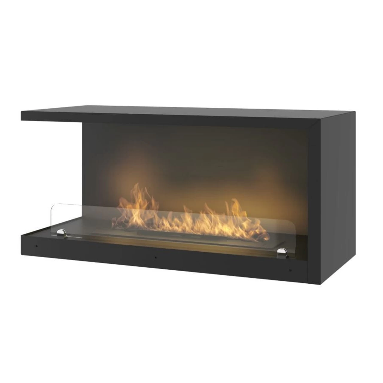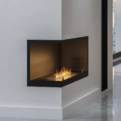 Das Eckmodell L800, mit offener linker Seite, ist bestens zum Einbau in einer Nische geeignet. Die Konstruktion des Ethanolkamins gewährleistet eine einfache Montage und eine effektive Ausarbeitung, ohne dass der Rand der Aussparung in der Wand ideal bearbeitet werden muss. Der Ethanolkamin ist mit einem Rahmen erhältich, der über die Umrisse des Kamins hinausragt und die Wand überlappt (je nach Variante). Die leicht getönte Scheibe stabilisiert das Feuer und verleiht ein einzigartiges Aussehen.