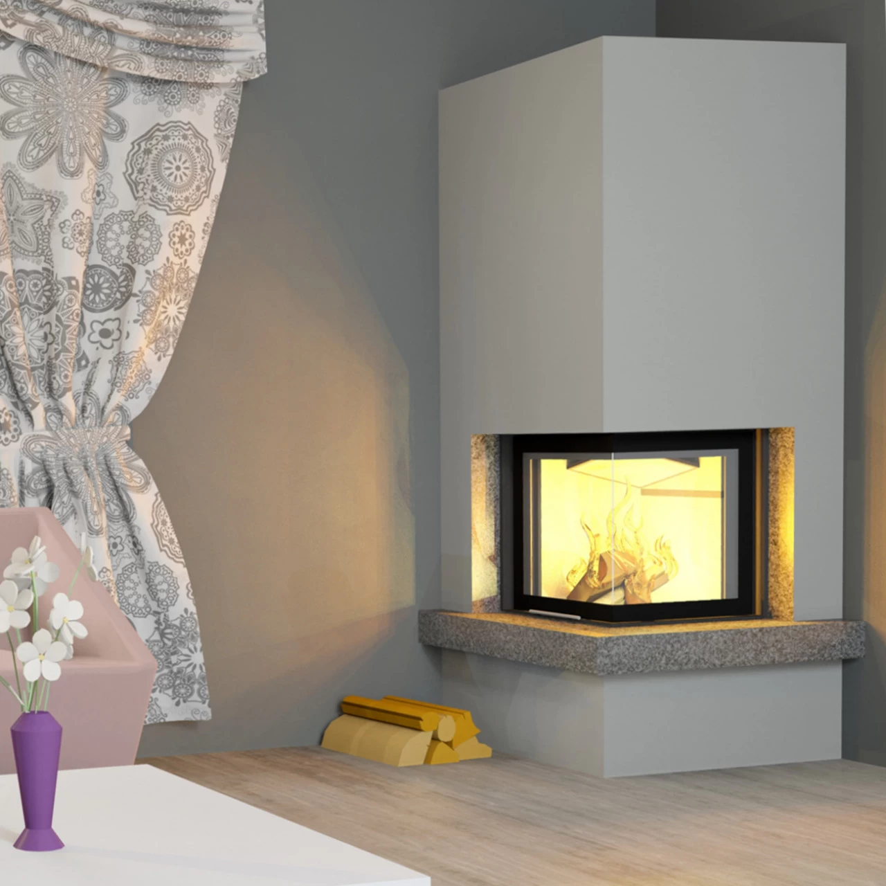 Modell: Hajduk Smart 2PTH Warmluft-Eckkamineinsatz Rechtsverglast, rahmenlose Hebetür mit einteiligem Glas (die Tür lässt sich zum Reinigen als schwenktür öffnen)