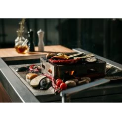 Praktischer zweiteiliger Aufsatz aus Edelstahl und zusätzlich mit einem Rost zum Grillen ausgestattet. Die Form und Größe sind einerseits dem Kochgeschirr angepasst und erlauben andererseits das einfache Befüllen mit Holz.