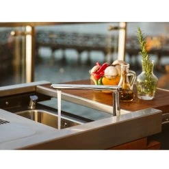 Küchenarbeitsplatten mit wechselnder Funktion und wechselndem Zweck. Sie klappen auf, vergrößern die Arbeitsfl äche sowie den Arbeitskomfort. Darunter gibt es einen Platz für einen gastronomischen Behälter Typ GN sowie eine funktionelle Spüle. Die Platten sind aus verleimtem exotischem Holz, mit erhöhtem Widerstand zu den Wetterbedingungen.