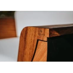 Die glänzenden Elemente sind aus Edelstahl. Sie schmücken nicht nur die Möbel, sondern geben ihnen vor allem Stabilität. Sie unterstreichen die solide Beschaffenheit und Perfektion der Anfertigung, garantieren dabei langjährige Nutzung, selbst bei intensivem Gebrauch und häufi ger Aussetzung ungünstiger Wetterbedingungen. In der Variante Cortenstahl bekommen die Möbelstücke mit der Zeit ein neues Aussehen, die Patina – Farbe wird dabei prachtvoll mit dem sonnigen Braun der Holzelemente übereinstimmen.