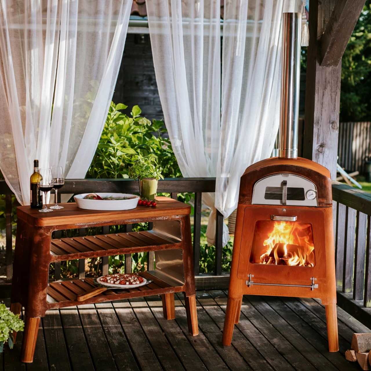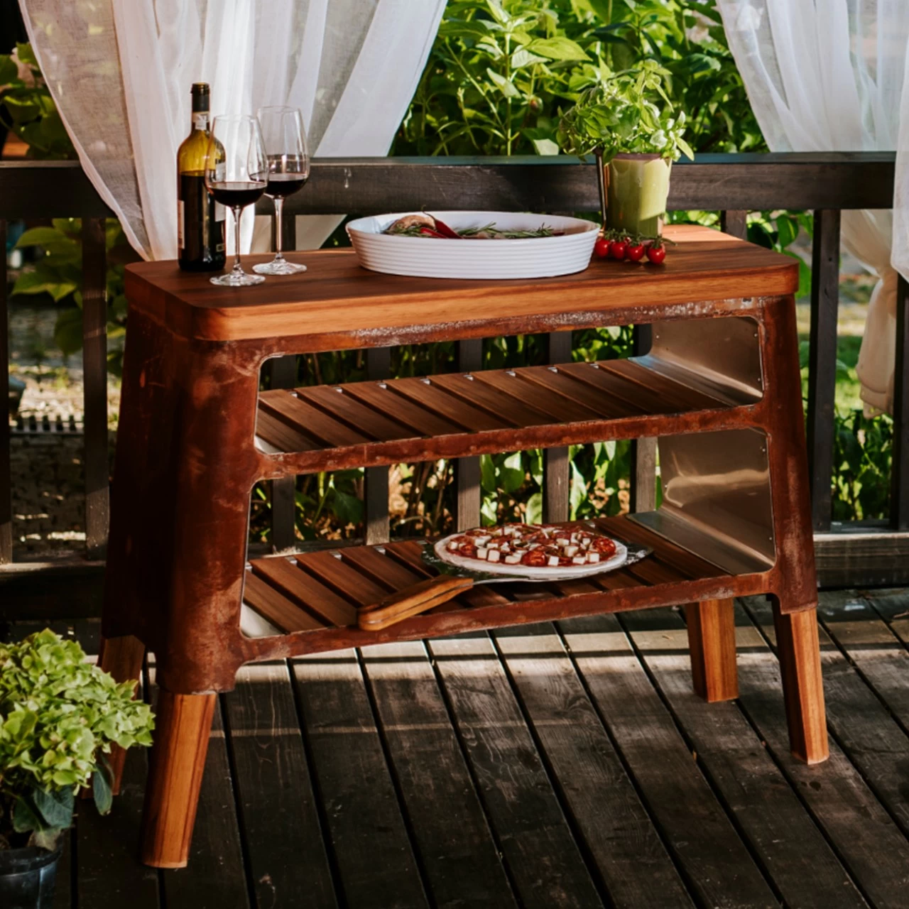 Ein Grilltisch aus der Kollektion Nexo ergänzt nicht nur perfekt den Kamin, bietet zusätzlichen Platz für Teller, Besteck oder Holz, sie kann auch als eigenständiges Möbelstück fungieren. Je nach Ausführung kann sie aus Cortenstahl oder Edelstahl und exotischem Holz gefertigt werden. Darüber hinaus passt sie perfekt in jeden Raum. Ein geräumiges Brett erfüllt Bedürfnisse von allen