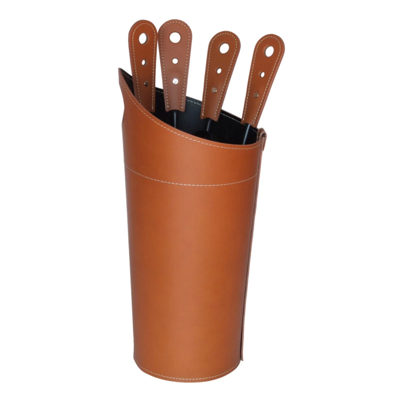 Set bestehend aus Kaminbesteckhalter aus Leder mod. „Nidac“ und 4-teiliges Kaminbesteck mit Ledergriff mod. „Lara“