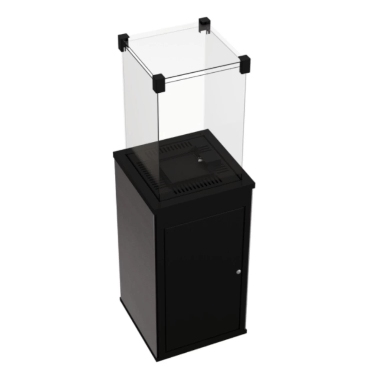 Das untere Teil des Gehäuses besteht aus Stahl und wird von drei schwarzen Glaspanelen ummantelt. Die vierte Seite ist mit einer Stahl Tür mit Schloss ausgestattet und beim Patio Mini mit einer Stahl Aushägetür.