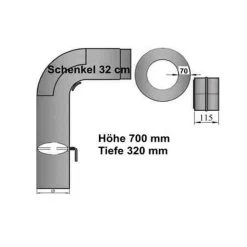 Ein Rohr mit gezogenem Bogen 90° mit Drosselklappe und Reinigungsverschluss zur Verbindung der Feuerstätte mit dem Schornstein. Der verschließbare Reinigungsverschluss dient zum reinigen und überprüfen des waagerechten Rohrteils. Die Drosselklappe dient als als zusätzliche Regulierung des Feuers bei zum Beispiel zu starken Schornsteinzug oder Brennstoffwechsel wie Kohle, Holzbriketts usw..