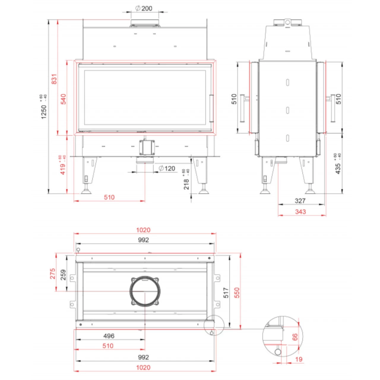 Maße des Kamins: Höhe: 125,0 (+6,0/-4,0) cm x Breite: 102,0 cm x Tiefe: 55,0 cm