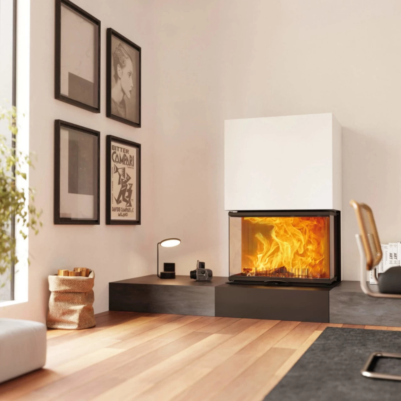 - Kamin-Scheibenform: Panorama Scheibe – 3 seitig verglast
